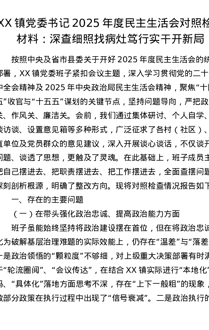XX镇党委书记2025年度五个带头xxxxx对照检查材料:深查细照找病灶 笃行实干开新局
