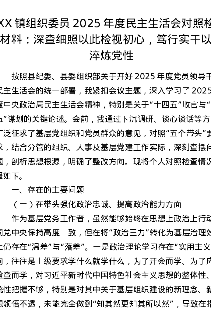 XX镇组织委员2025年度五个带头xxxxx对照检查材料:深查细照以此检视初心,笃行实干以此淬炼党性