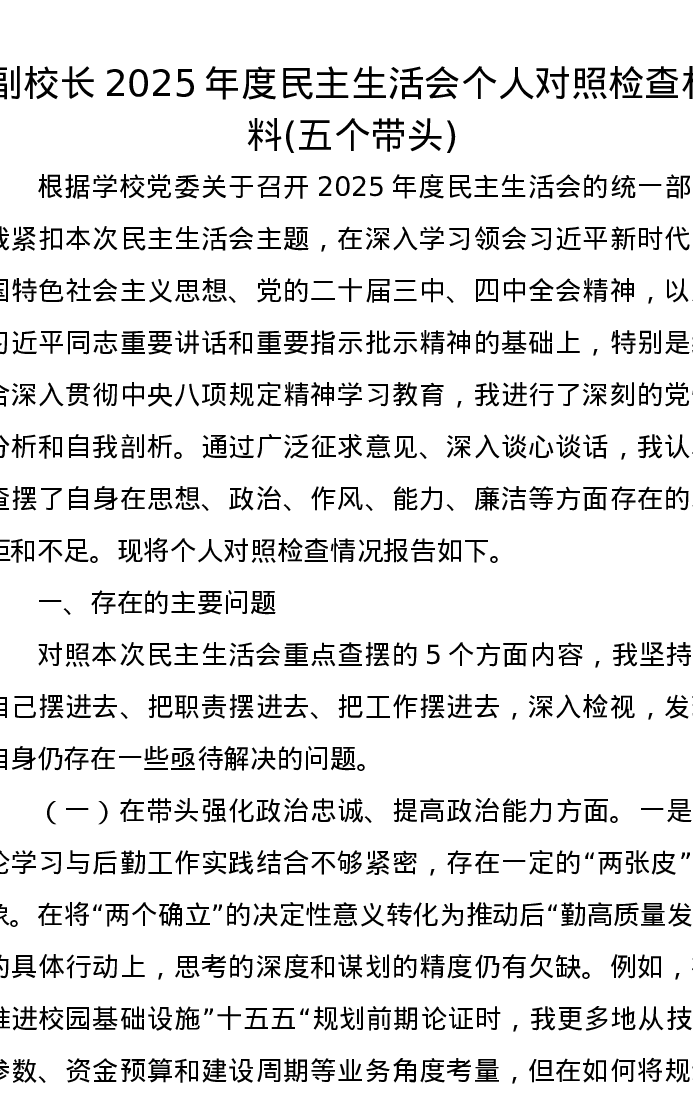 副校长2025年度xxxxx个人对照检查材料(五个带头)