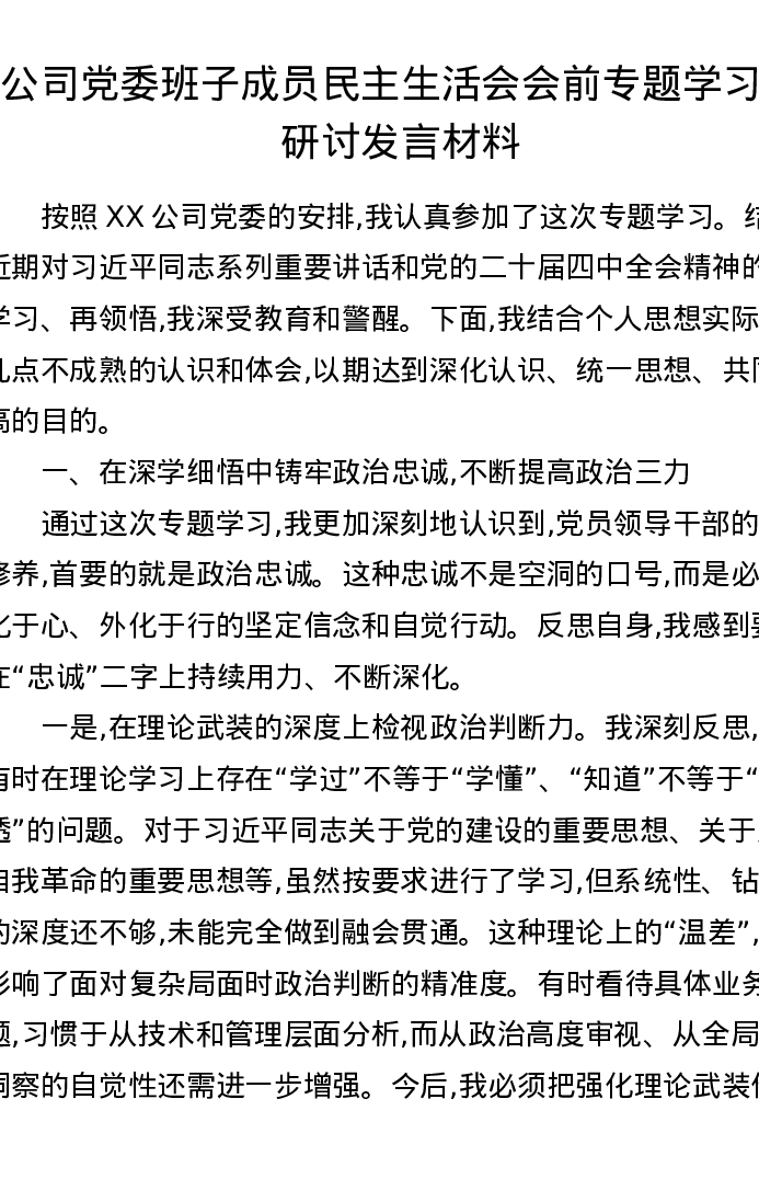公司党委班子成员xxxxx会前专题学习会研讨发言材料(五个带头)