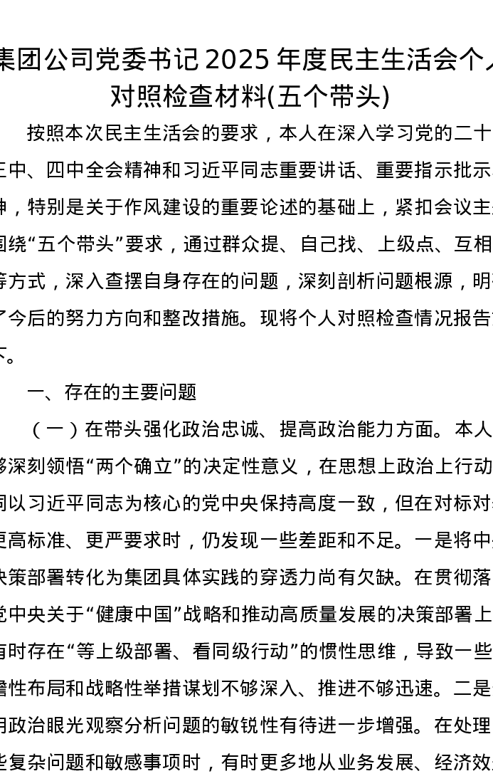 集团公司党委书记2025年度xxxxx个人对照检查材料(五个带头)