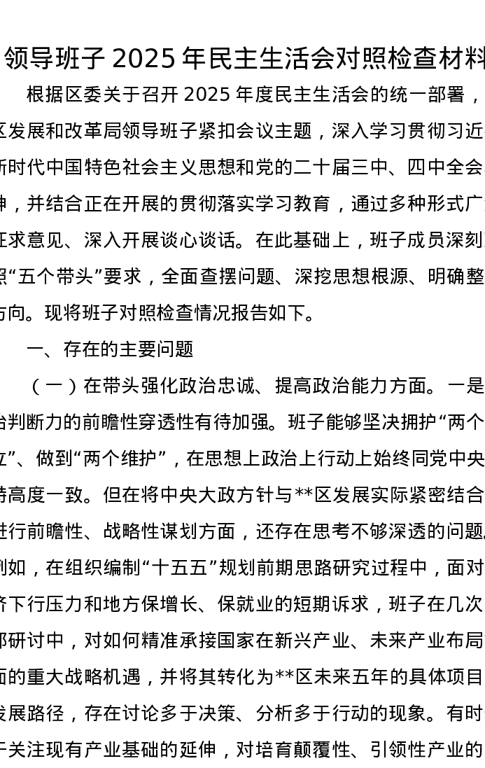 领导班子2025年xxxxx对照检查材料(五个带头)