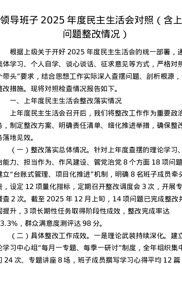 领导班子2025年度xxxxx对照(含上年问题整改情况)(五个带头)