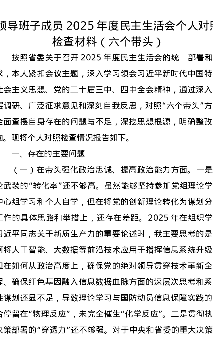 领导班子成员2025年度xxxxx个人对照检查材料(六个带头)