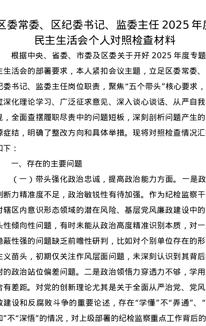 区委常委、区纪委书记、监委主任2025年度xxxxx个人对照检查材料(五个带头)