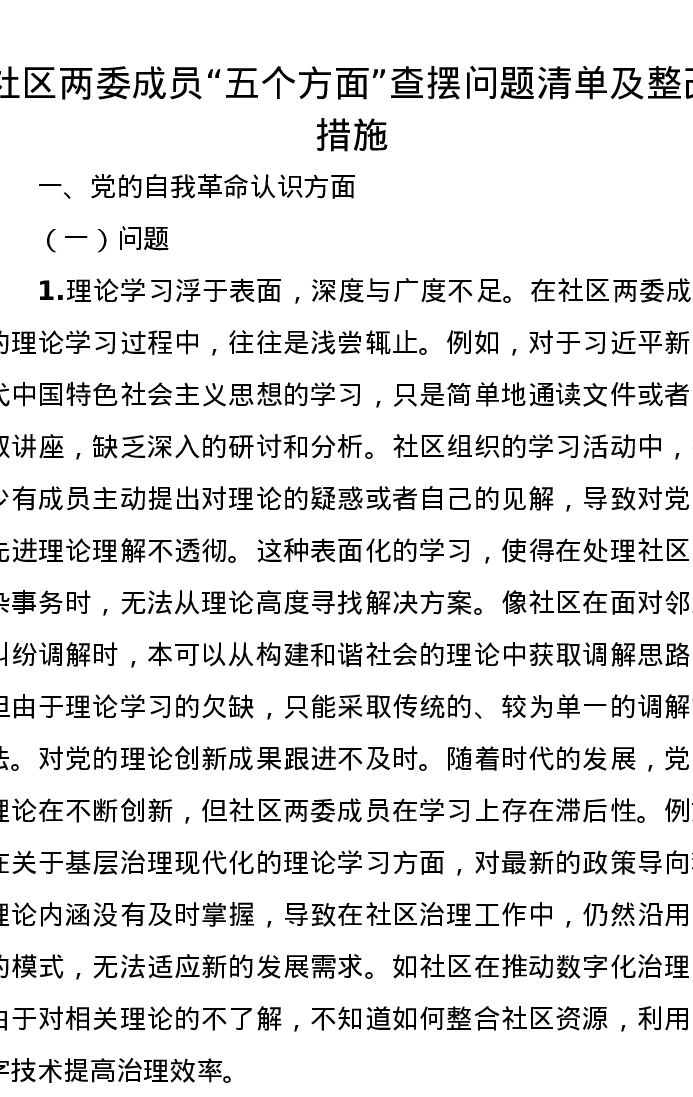 社区两委成员精神学习教育五个方面查摆问题清单及整改措施(5个方面)