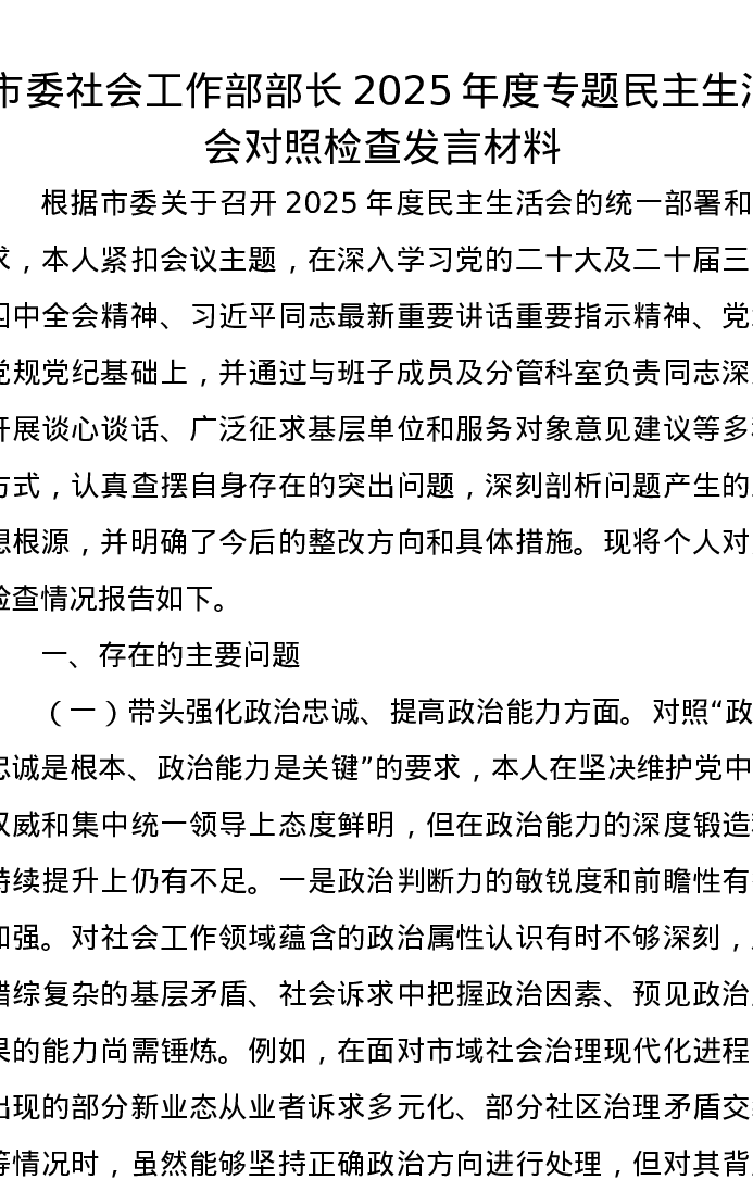 市委社会工作部部长2025年度专题xxxxx对照检查发言材料(五个带头)