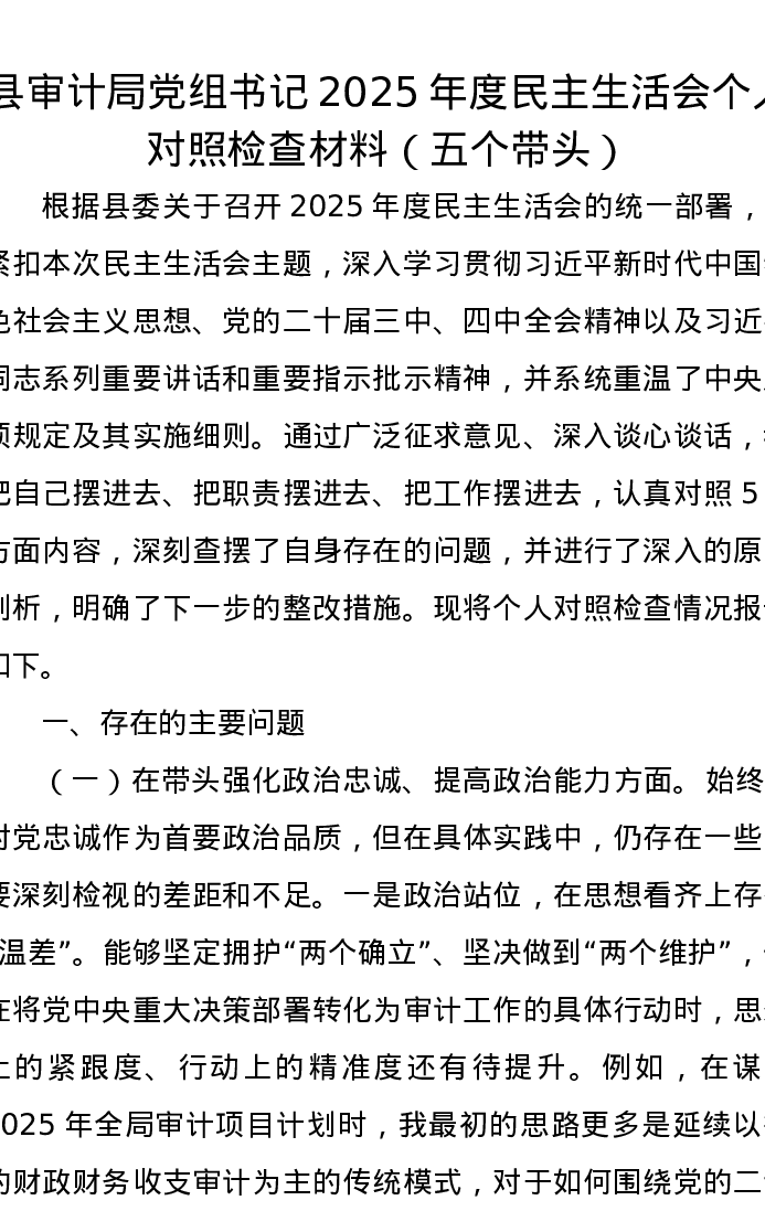 县审计局党组书记2025年度xxxxx个人对照检查材料(五个带头)