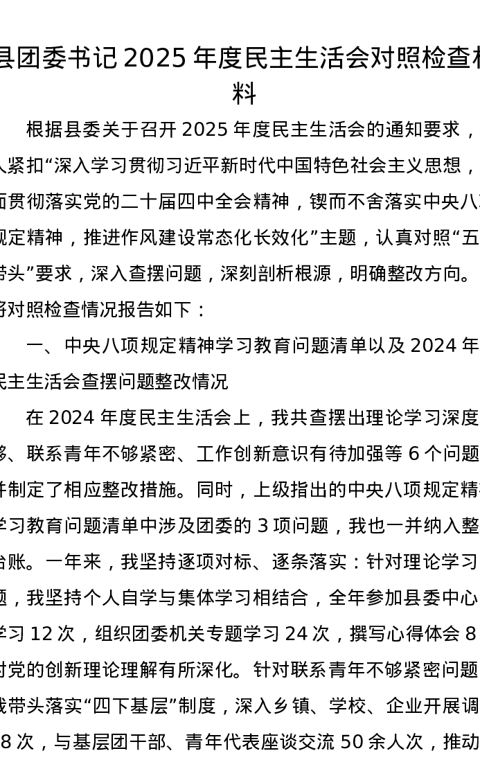 县团委书记2025年度xxxxx对照检查材料