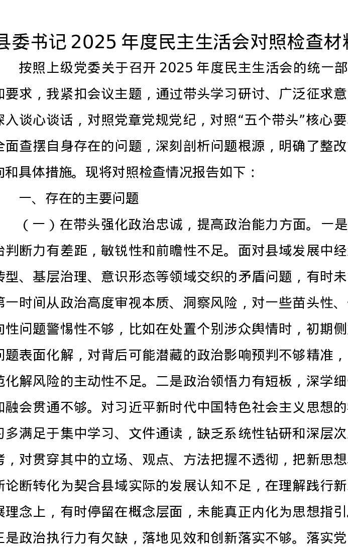 县委书记2025年度xxxxx对照检查材料(五个带头)