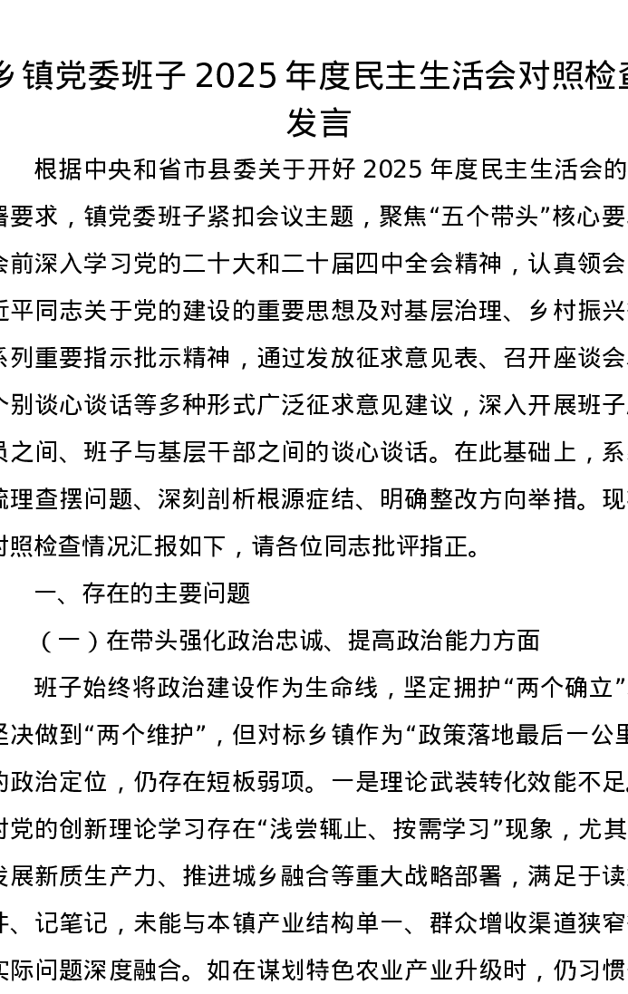 乡镇党委班子2025年度xxxxx对照检查发言(五个带头)