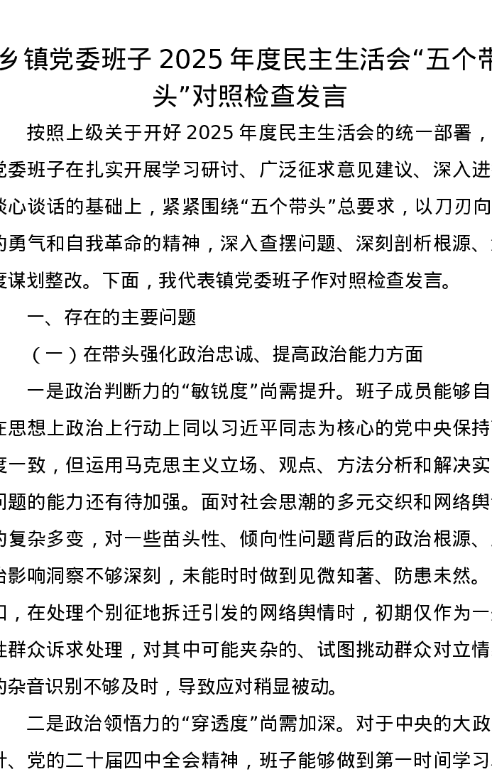 乡镇党委班子2025年度xxxxx五个带头对照检查发言