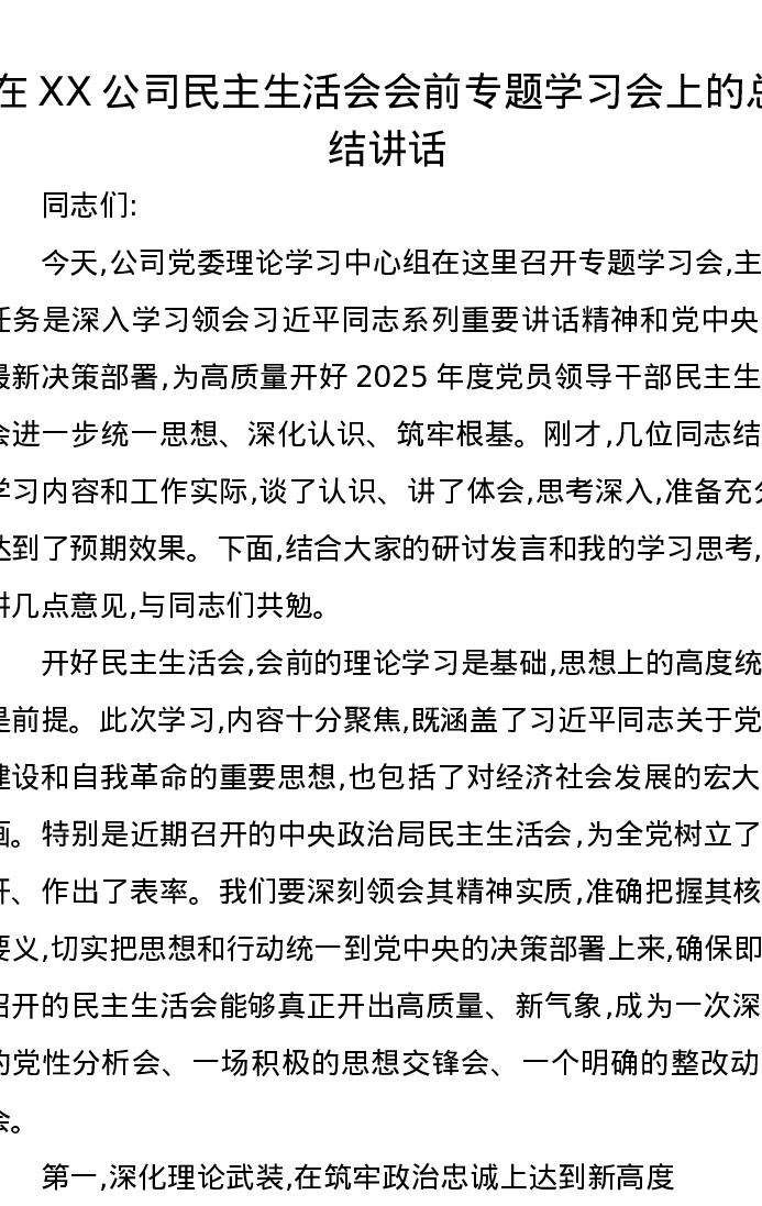 在XX公司xxxxx会前专题学习会上的总结讲话(五个带头)