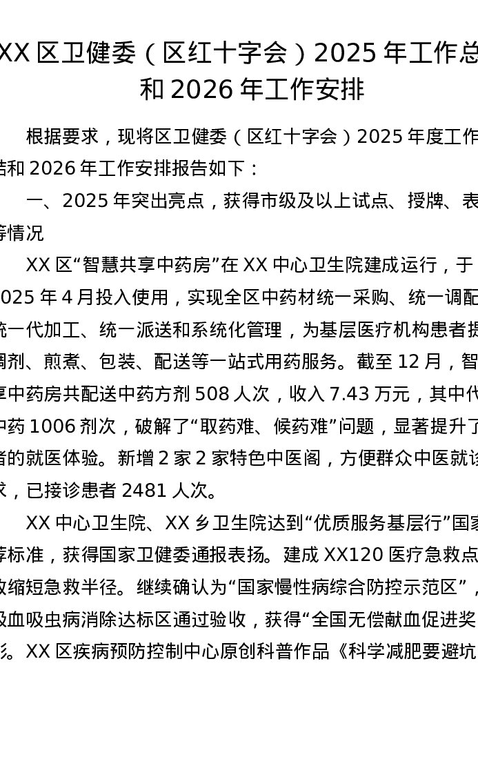 XX区卫健委(区红十字会)2025年工作总结和2026年工作安排