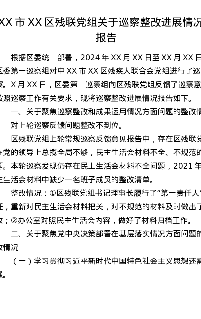 XX市XX区残联党组关于巡察整改进展情况的报告