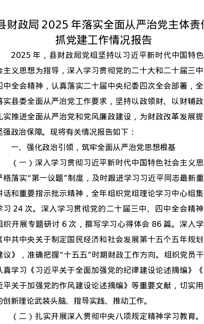县财政局2025年落实全面从严治党主体责任抓党建工作情况报告