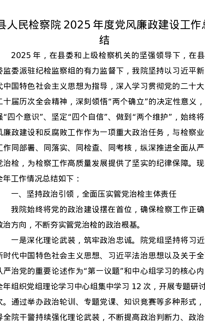 县人民检察院2025年度党风廉政建设工作总结