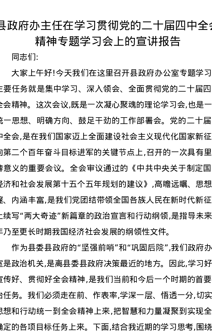 县政府办主任在学习贯彻党的二十届四中全会精神专题学习会上的宣讲报告