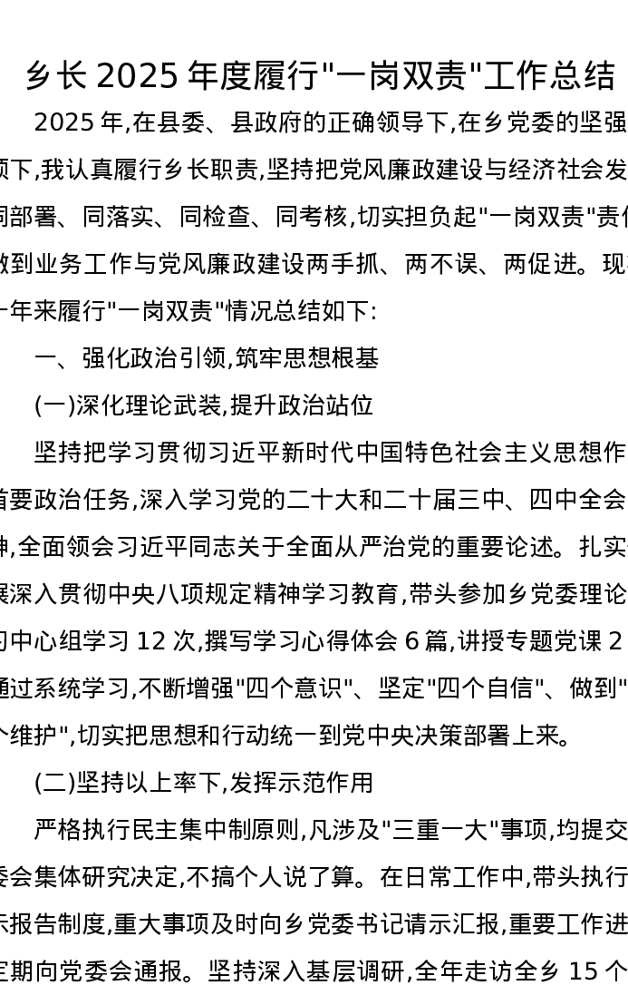 乡长2025年度履行一岗双责工作总结