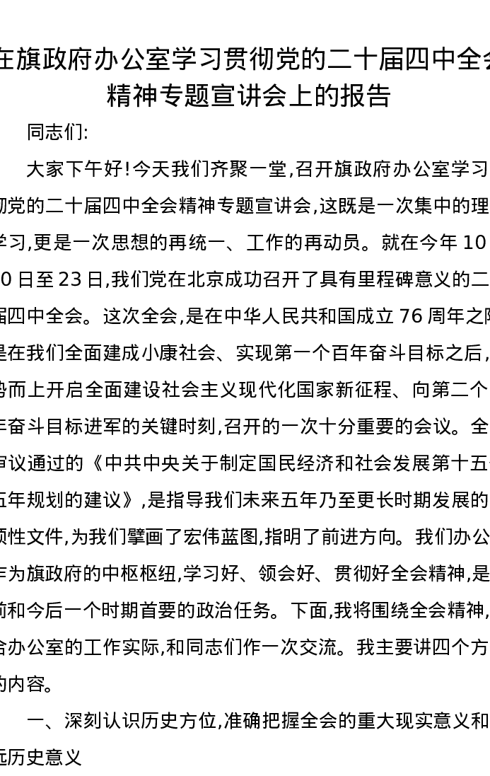 在旗政府办公室学习贯彻党的二十届四中全会精神专题宣讲会上的报告