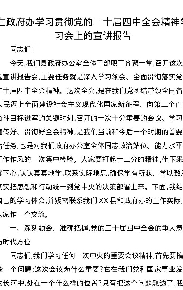 在政府办学习贯彻党的二十届四中全会精神学习会上的宣讲报告