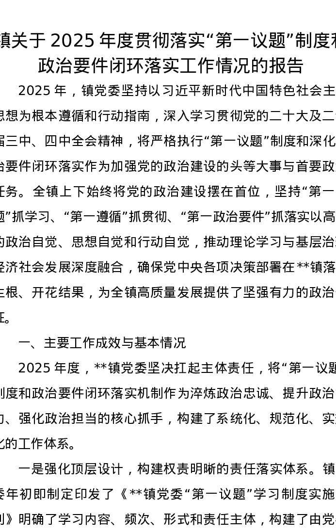 镇关于2025年度贯彻落实第一议题制度和政治要件闭环落实工作情况的报告
