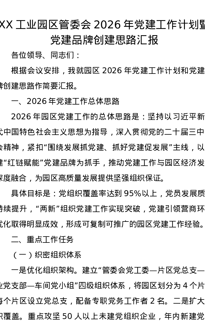XX工业园区管委会2026年党建工作计划暨党建品牌创建思路汇报