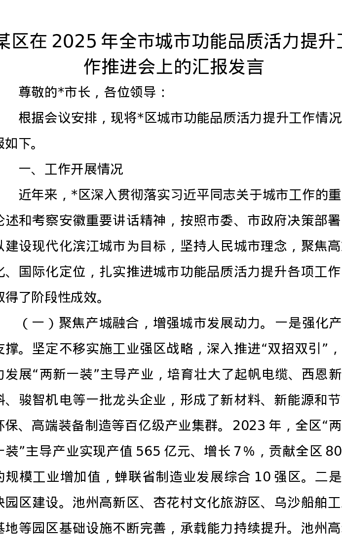 某区在2025年全市城市功能品质活力提升工作推进会上的汇报发言