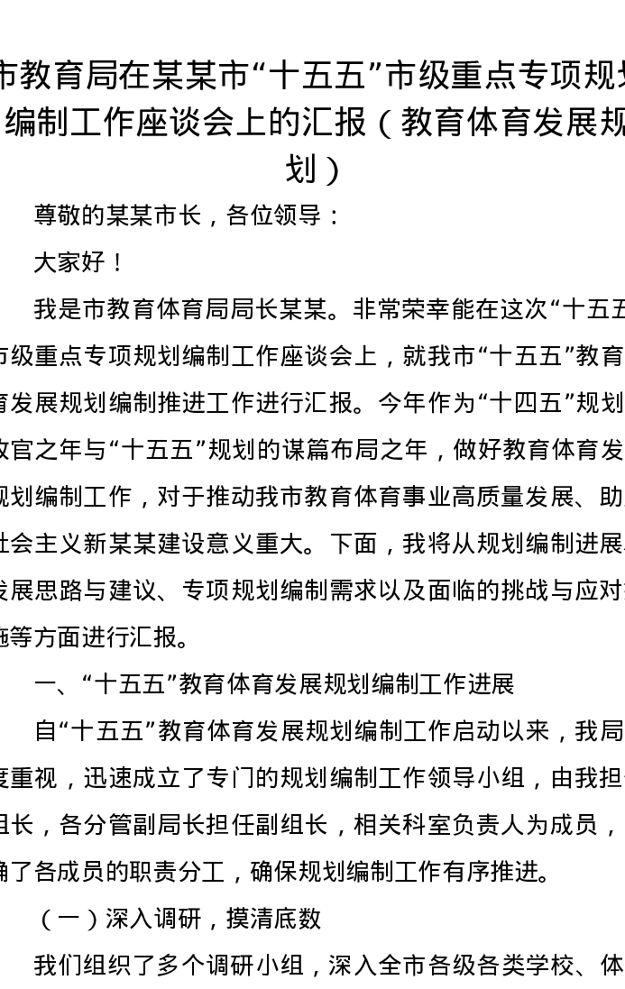 市教育局在某某市十五五市级重点专项规划编制工作座谈会上的汇报(教育体育发展规划)