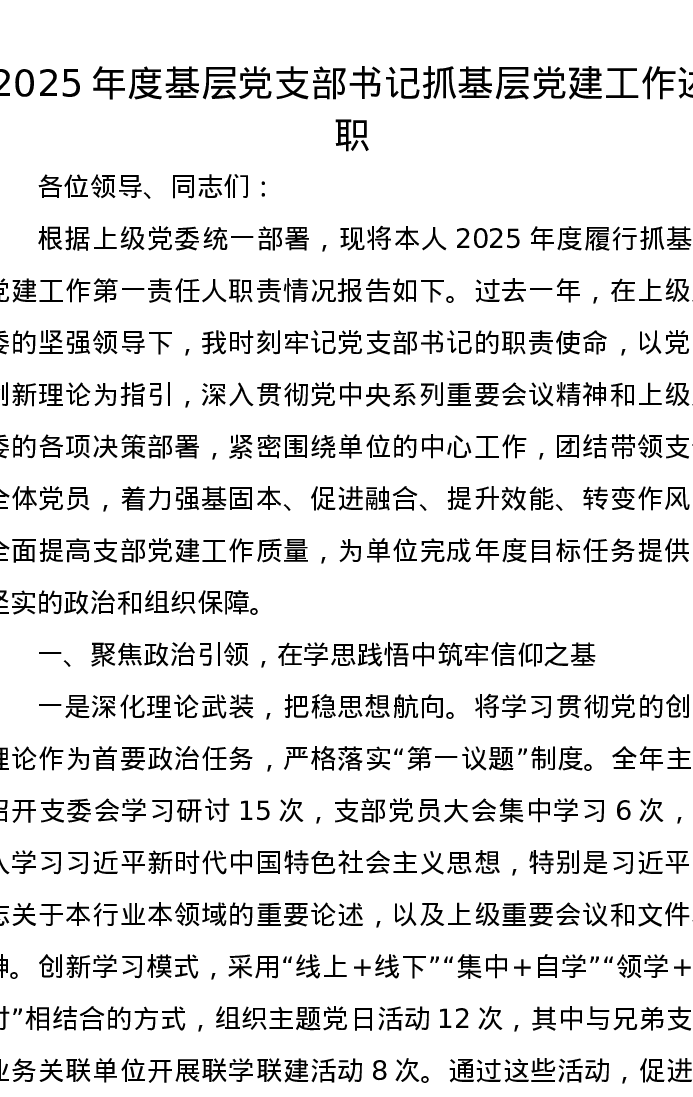 2025年度基层党支部书记抓基层党建工作述职