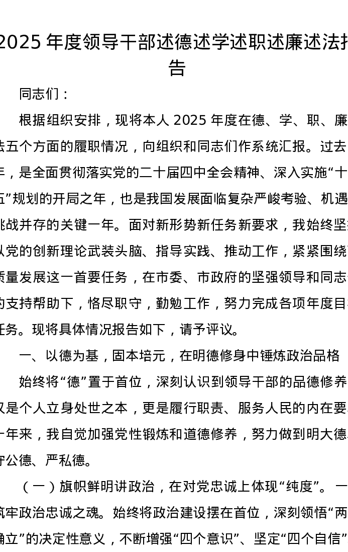 2025年度领导干部述德述学述职述廉述法报告