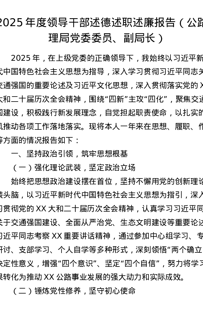 2025年度领导干部述德述职述廉报告(公路管理局党委委员、副局长)