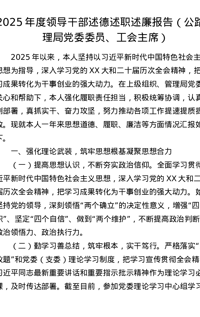 2025年度领导干部述德述职述廉报告(公路管理局党委委员、工会主席)