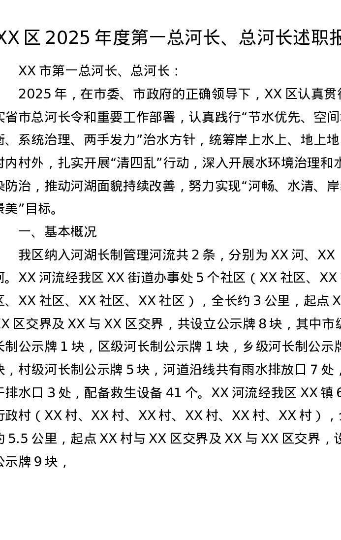 XX区2025年度第一总河长、总河长述职报告