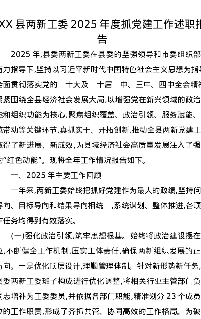 XX县两新工委2025年度抓党建工作述职报告