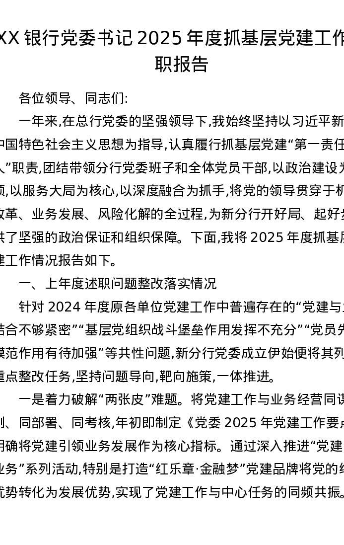 XX银行党委书记2025年度抓基层党建工作述职报告