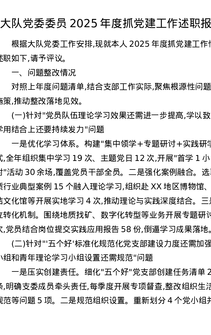 大队党委委员2025年度抓党建工作述职报告