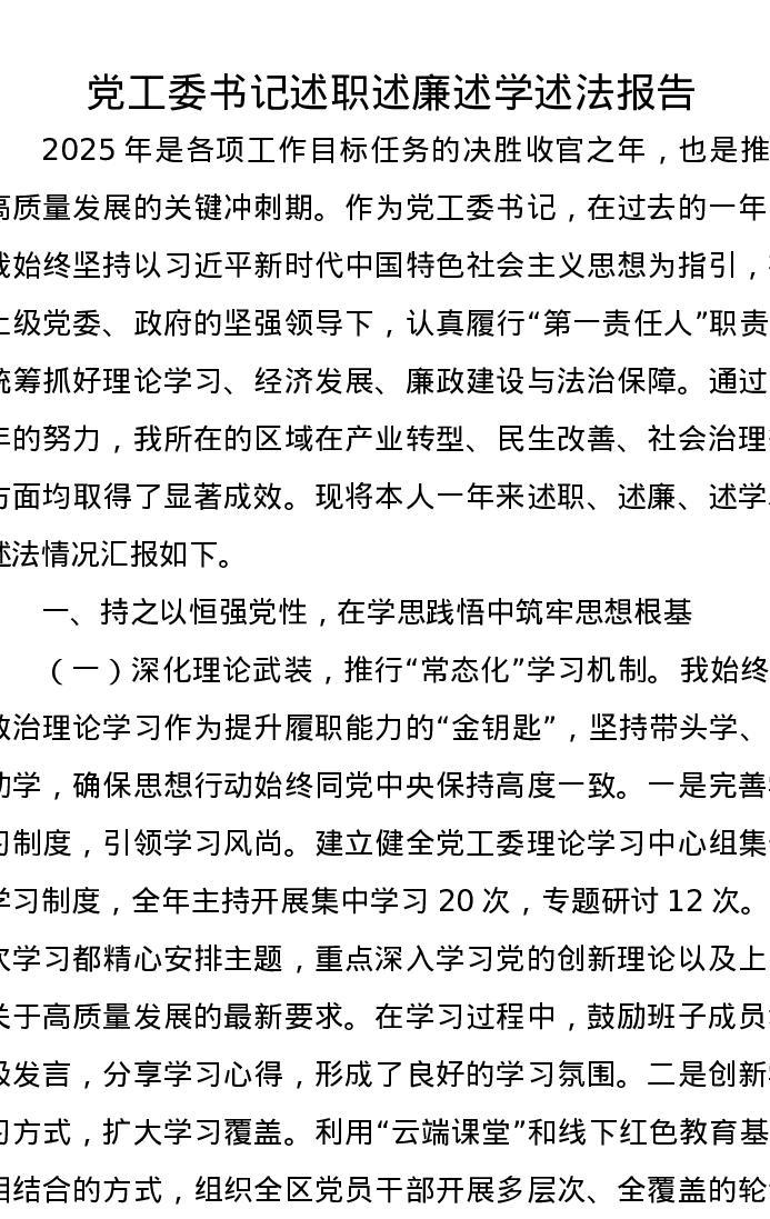 党工委书记述职述廉述学述法报告