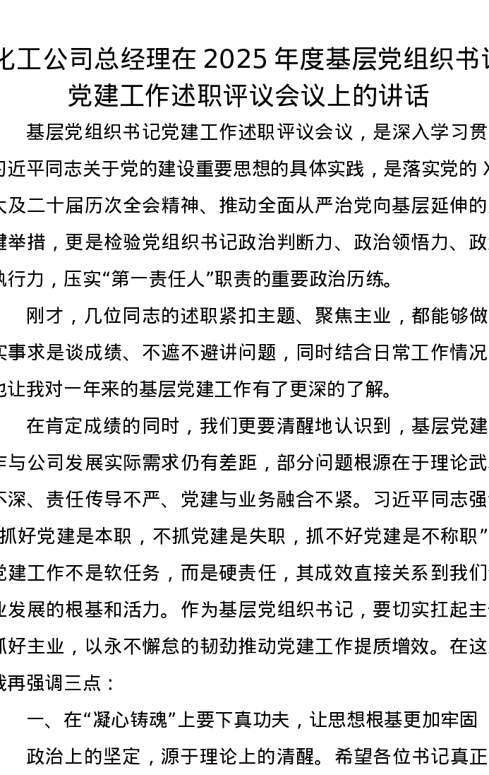 化工公司总经理在2025年度基层党组织书记党建工作述职评议会议上的讲话