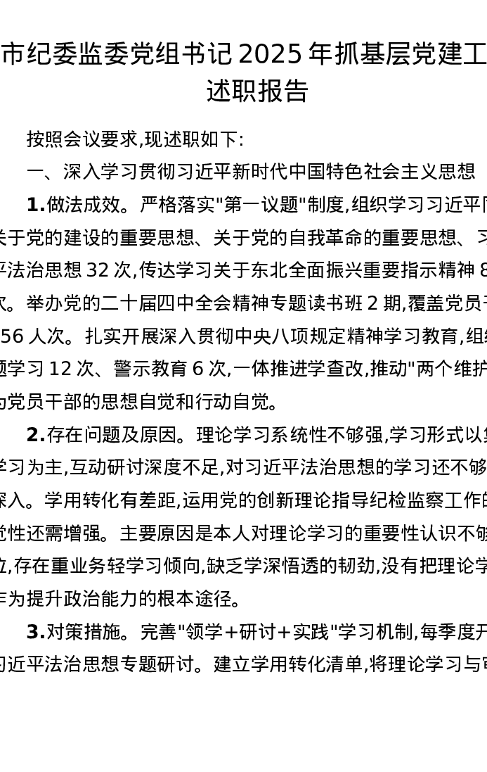 市纪委监委党组书记2025年抓基层党建工作述职报告