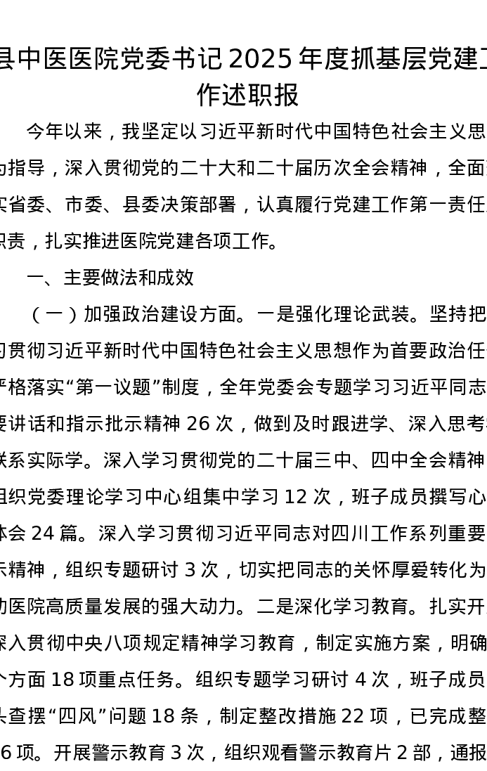 县中医医院党委书记2025年度抓基层党建工作述职报
