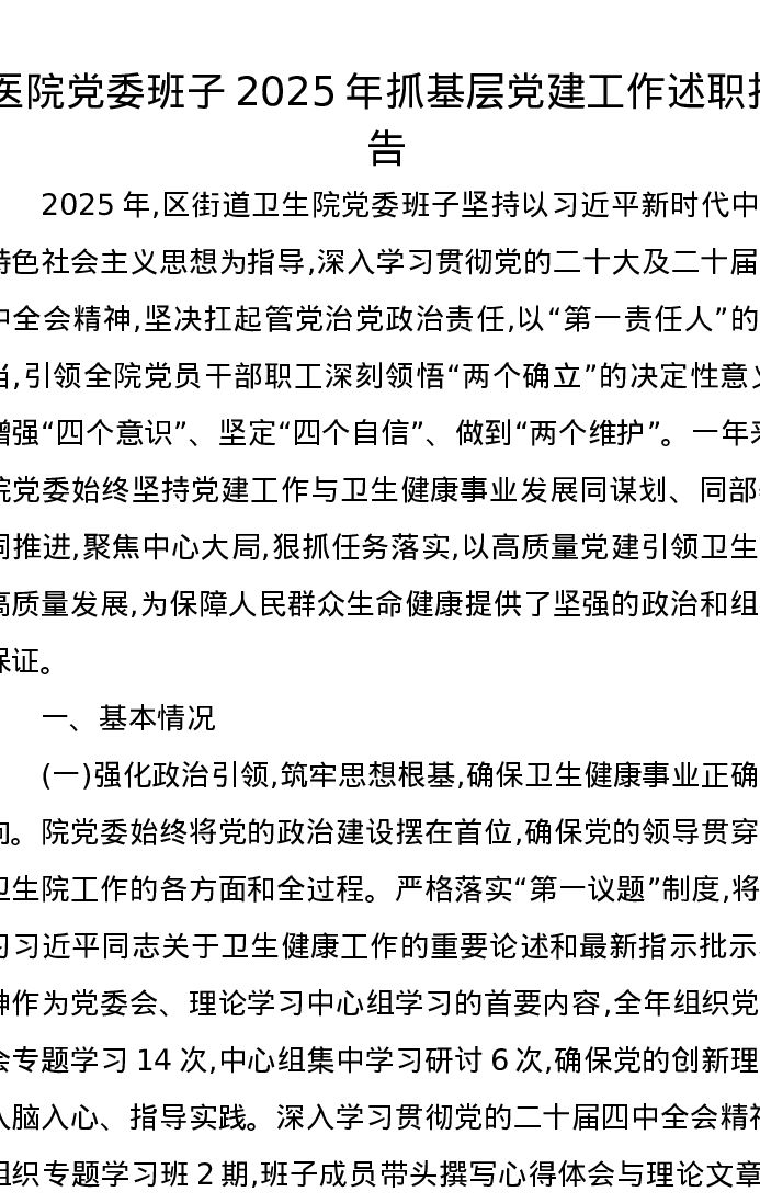 医院党委班子2025年抓基层党建工作述职报告