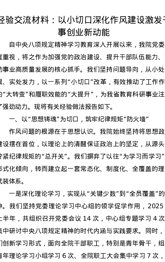 经验交流发言材料:以小切口深化作风建设激发干事创业新动能