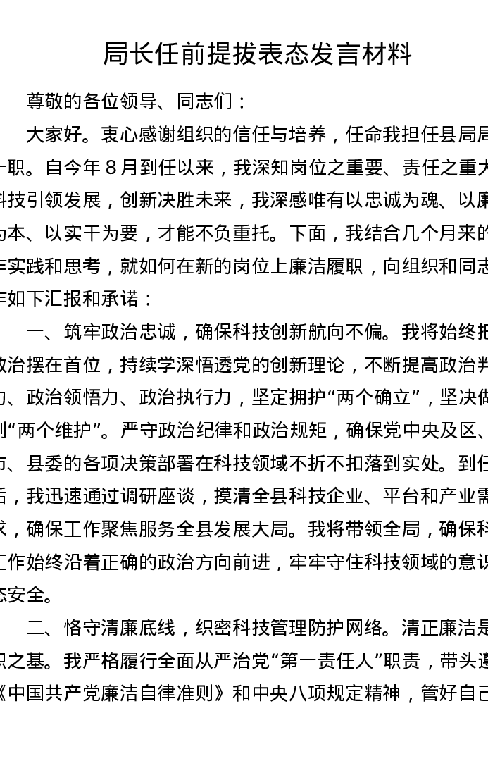 局长任前提拔表态发言材料