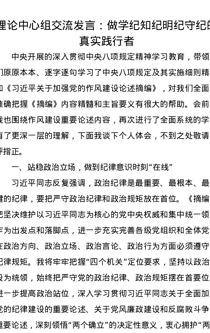 理论中心组交流发言:做学纪知纪明纪守纪的真实践行者