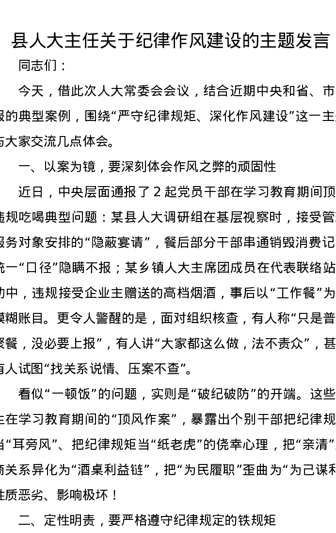 县人大主任关于纪律作风建设的主题发言