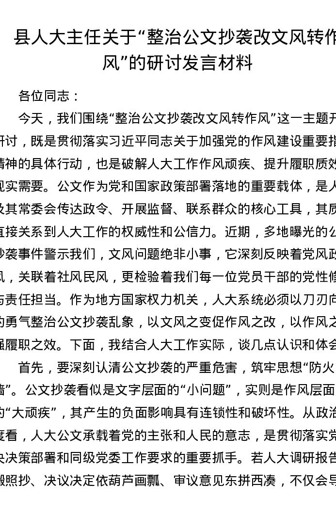 县人大主任关于整治公文抄袭 改文风转作风的研讨发言材料(3167字)