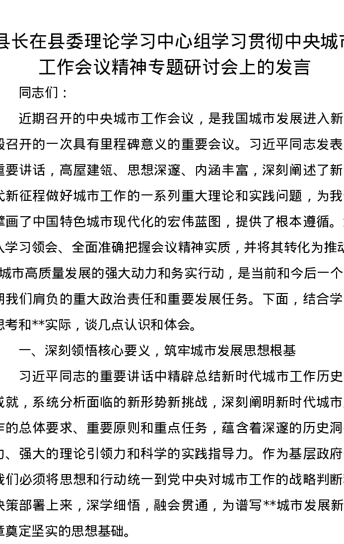 县长在县委理论学习中心组学习贯彻中央城市工作会议精神专题研讨会上的发言