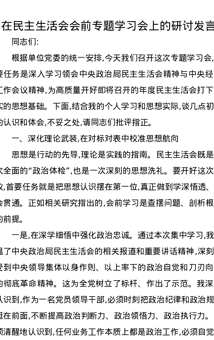 在xxxxx会前专题学习会上的研讨发言