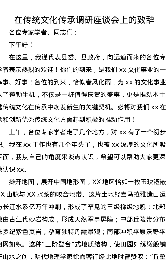 在传统文化传承调研座谈会上的致辞
